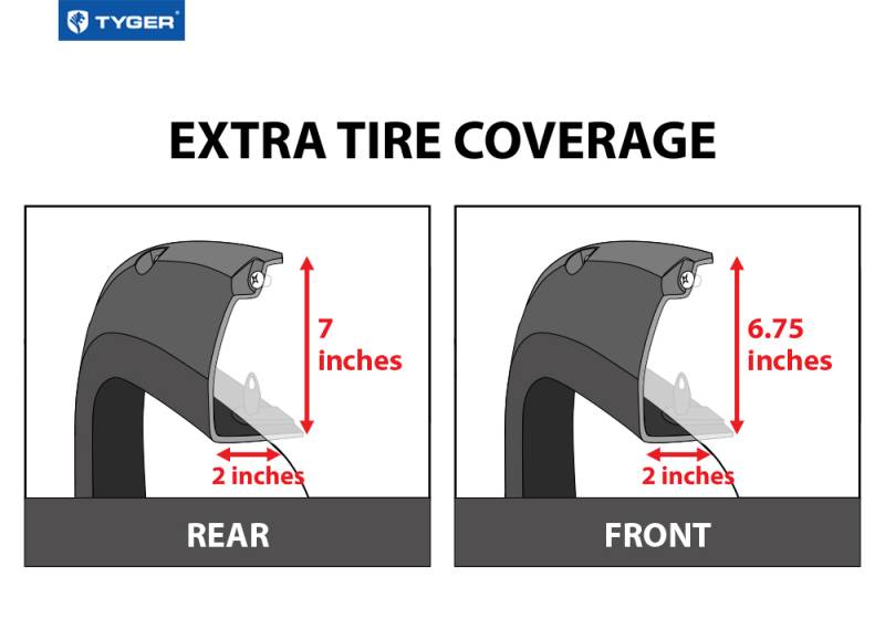 - Dimensions - Flare Height: 6.75.0 Inch front and 7.0 Inch rear. Tire Coverage: 2.0 Inch front and rear.