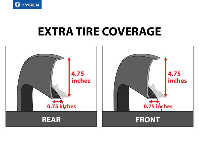 - Dimensions - Flare Height: 4.75.0 Inch front and rear. Tire Coverage: 0.75.0 Inch front and rear.