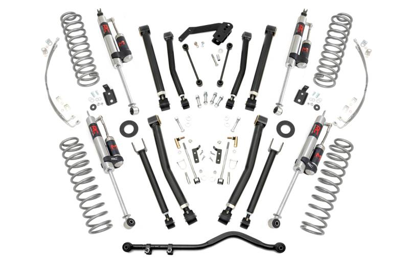 Total transformation on and off the trail starts with Rough Country's 4-Inch X-Series Suspension Lift Kit for Jeep. This all-inclusive package delivers aggressive styling, increased ground clearance, and enhanced off-road capability for the ultimate upgrade.Precision Adjustable Control Arms: This kit includes front and rear upper and lower X-Flex Control Arms featuring a high-clearance design. Built with OEM-style rubber bushings, fully rebuildable flex joints, and massive 2.5-inch diameter bodies with 1.25-inch threads, these arms are fully greasable for long-lasting durability and superior articulation. Fine-tune your ride height and suspension geometry with ease.Optimized Suspension Geometry: Lifted coil springs and rear coil correction plates provide the perfect combination of ride height and vibration dampening. The correction plates adjust the rear coil spring angle by 10 degrees, allowing for optimal suspension performance across any terrain.Heavy-Duty Forged Adjustable Track Bar: Strength and stability are delivered by a 16-pound forged solid steel Adjustable Front Track Bar. This heavy-duty component outmatches stock parts, maintaining precise axle alignment and control even during extreme off-road flexing. It's fully adjustable on the vehicle and easy to install.Custom Shock Options for Any Terrain: Select from nitrogen-charged N3 shocks, V2, M1 Monotube, or premium M1R shocks to match your driving style. From versatile daily comfort to maximum off-road control, this kit lets you tailor your suspension for any adventure.Confident, Balanced Stance: This lift kit levels the front of your Jeep with the rear, creating a commanding, well-balanced look that performs as good as it looks.Peace of Mind Guaranteed: Backed by Rough Country's Limited Lifetime Replacement Warranty, you can hit the trails knowing your investment is protected.