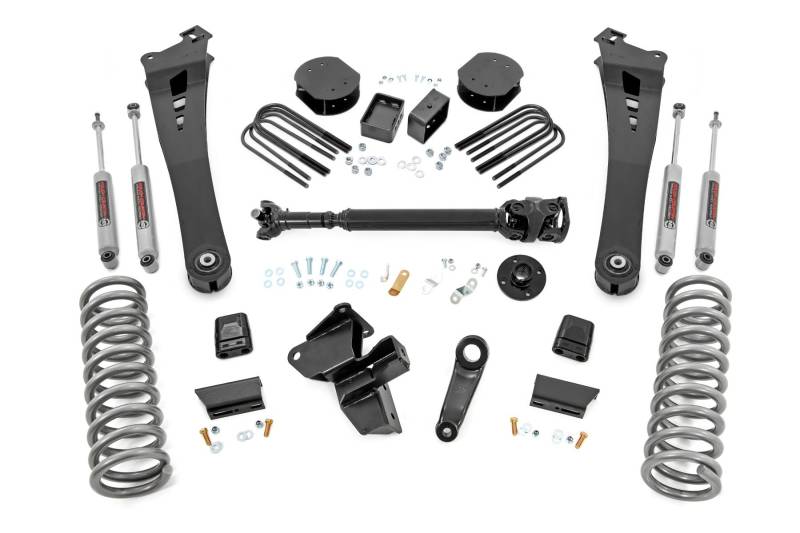 Commanding Lift. Confident Performance: Transform your RAM 3500 with Rough Country's 5-Inch Lift Kit, engineered for bold looks and off-road domination. Featuring linear coil springs, a heavy-duty front driveshaft, and application-valved N3 shock absorbers, this kit delivers increased ground clearance, leveled stance, and trail-tested performance, all while maintaining a smooth, factory-like ride.Precision Suspension Engineering: Maintaining proper suspension geometry is critical for both on- and off-road control. This kit includes a drop pitman arm to correct steering angles and a track bar drop bracket to keep your front axle perfectly centered, ensuring stable, predictable handling at every turn.Heavy-Duty Radius Arms: Custom radius arms bolt directly to factory mounts and retain factory-like angles. Outfitted with premium rubber bushings, they minimize vibration and noise while maximizing ride comfort and suspension travel.Linear Coil Springs for Consistency: Front and rear linear-rate coil springs offer a reliable, controlled ride with balanced articulation and load handling, perfect for daily driving, towing, or backcountry exploring.Upgraded Front Driveshaft Included: This kit comes complete with a high-clearance front driveshaft designed to accommodate added articulation and drivetrain angles, no need for costly aftermarket upgrades.Includes N3 Series Shocks: Rough Country's N3 shocks are specifically valved for your RAM 3500, delivering balanced performance both on the highway and in rugged off-road environments.Clears 37-Inch Tires with Ease: Run aggressive 37-inch tires with confidence. This kit gives your RAM the clearance it needs for true off-road capability and a head-turning stance.