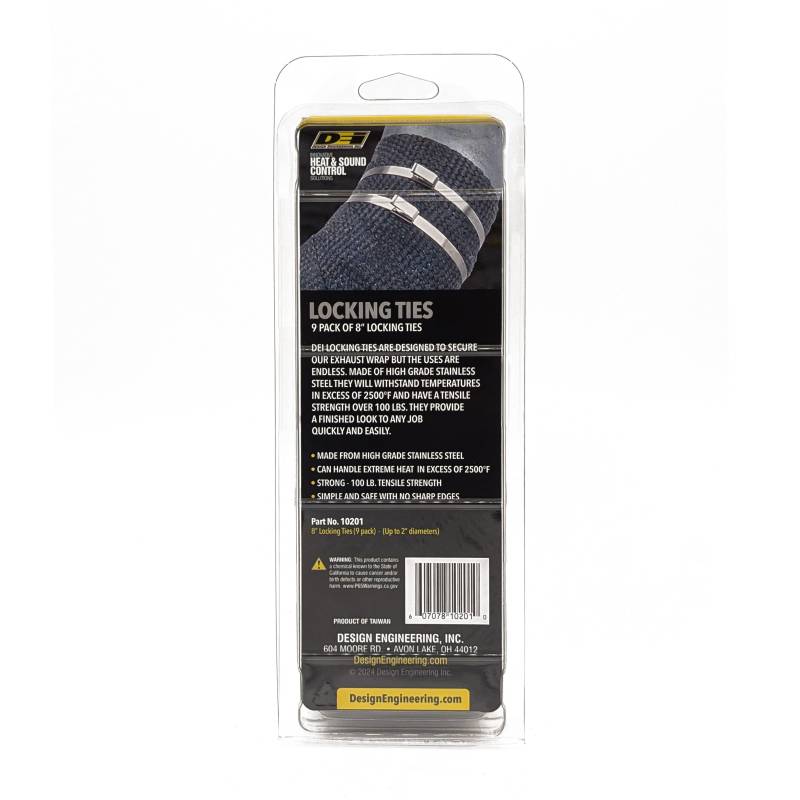 SS Locking Ties 8in 9pk Stainless-Steel Locking Ties secure exhaust wrap and solves the problem of needing a locking tie in high heat areas. Stainless-Steel Locking Ties are perfect for securing wrap to pipes with its self-locking design. Locking Ties offer many other uses including bundling wires, hoses, and other forms of insulation products. Just slide end into locking mechanism and pull tight. Constructed from high grade 316 stainless steel Capable of wit'standing in excess of 2500F 100lbs tensile strength Fits up to 2 in. O.D. Constructed Of High Grade 304 Stainless Steel Capable Of Wit'standing Heat In Excess Of 2500 Degrees F Strong 100 lb. Tensile Strength