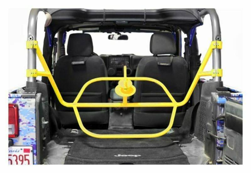 The Steinjager internal tire carrier is designed to hold up to a 35" tire inside the cab of your Jeep while still leaving you storage room for tools and a cooler. It simply mounts to the factory roll bar with four clamps. Steinjager has designed and manufactured a polyurethane centering device that will center the wheel and hold it securely while off-roading. The angle of the tire makes it simple to lift the tire into the back of your Jeep and lay if down on the tire carrier. The "baja" style wing nut also means you don't have to maneuver a 70+ lb wheel around while trying to line up the lug studs. Rear Seat will need to be removed. Roll bar padding will need to be modified or removed for proper function. Not recommended to use with steel wheels. You will not be able to tighten the wheel down to the main body.