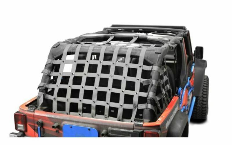 This Teddy Top Cargo Net covers the back half and sides of your 4 Door JK. The open design allows for great visibility while keeping your cargo inside the vehicle. The simple, yet effective, double back straps allow for adjustability and easy installation. The Teddy Top Cargo Net can stay in place with the top up so there is no need to remove it once its installed.