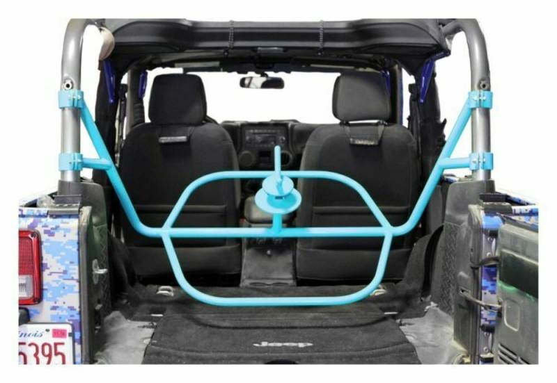 The Steinjager internal tire carrier is designed to hold up to a 35" tire inside the cab of your Jeep while still leaving you storage room for tools and a cooler. It simply mounts to the factory roll bar with four clamps. Steinjager has designed and manufactured a polyurethane centering device that will center the wheel and hold it securely while off-roading. The angle of the tire makes it simple to lift the tire into the back of your Jeep and lay if down on the tire carrier. The "baja" style wing nut also means you don't have to maneuver a 70+ lb wheel around while trying to line up the lug studs. Rear Seat will need to be removed. Roll bar padding will need to be modified or removed for proper function. Not recommended to use with steel wheels. You will not be able to tighten the wheel down to the main body.