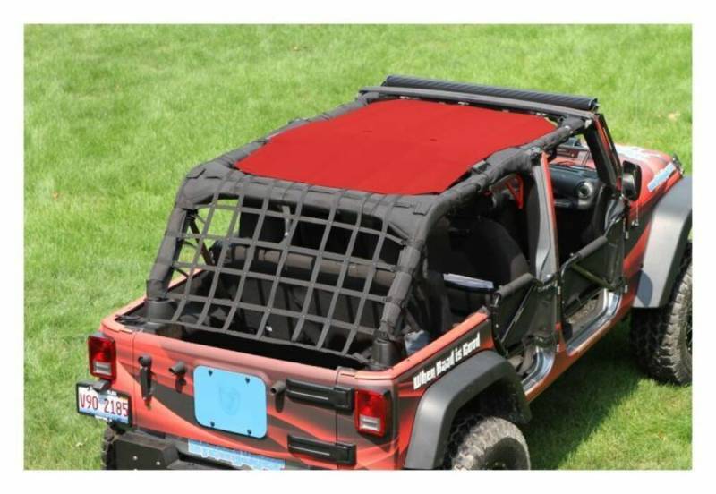The Steinjager Teddy Top Solar Screen Cover easily installs in minutes with the use of the supplied bungee balls. There are cut-outs in the top to allow you to leave this cover on even when you have your factory top installed. The Steinjager solar Teddy Top also fits with the Steinjager Cargo Net. Covers front and rear seats.