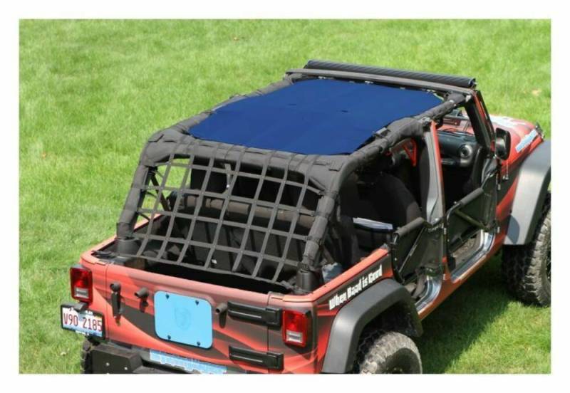 The Steinjager Teddy Top Solar Screen Cover easily installs in minutes with the use of the supplied bungee balls. There are cut-outs in the top to allow you to leave this cover on even when you have your factory top installed. The Steinjager solar Teddy Top also fits with the Steinjager Cargo Net. Covers front and rear seats.