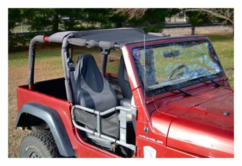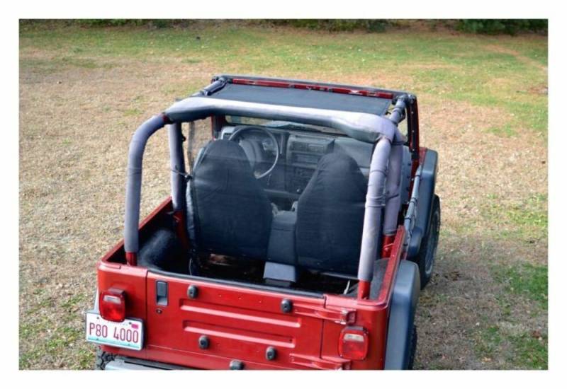 The Steinjager Teddy Top Truckster slides between the sound bar and the roll bar. It is easily installed with the use of bungee balls to hold it in place. The Truckster Top provides limited protection for the driver and passenger by blocking access to the cab from the top and back. The solar screen mesh also provides partial shade while still allowing visibility.