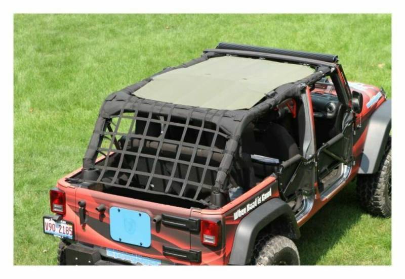 The Steinjager Teddy Top Solar Screen Cover easily installs in minutes with the use of the supplied bungee balls. There are cut-outs in the top to allow you to leave this cover on even when you have your factory top installed. The Steinjager solar Teddy Top also fits with the Steinjager Cargo Net. Covers front and rear seats.