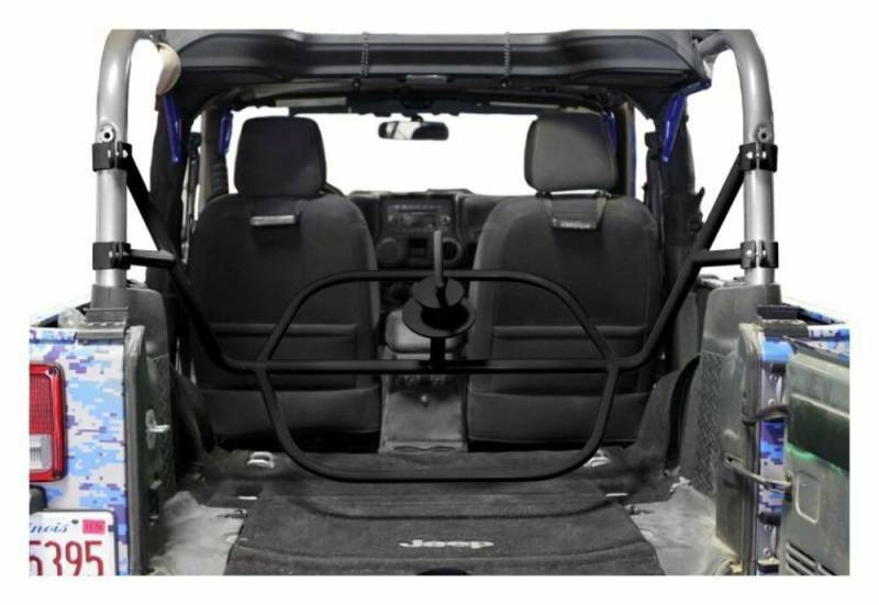 The Steinjager internal tire carrier is designed to hold up to a 35" tire inside the cab of your Jeep while still leaving you storage room for tools and a cooler. It simply mounts to the factory roll bar with four clamps. Steinjager has designed and manufactured a polyurethane centering device that will center the wheel and hold it securely while off-roading. The angle of the tire makes it simple to lift the tire into the back of your Jeep and lay if down on the tire carrier. The "baja" style wing nut also means you don't have to maneuver a 70+ lb wheel around while trying to line up the lug studs. Rear Seat will need to be removed. Roll bar padding will need to be modified or removed for proper function. Not recommended to use with steel wheels. You will not be able to tighten the wheel down to the main body.