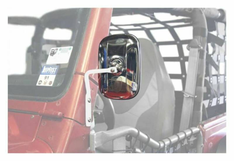 Steinjager's A-Pillar Side Mirror kits use the factory A Pillar hardware to secure the brackets to the A Pillar. These brackets will have to be removed when the factory doors and mirrors are installed, or they will interfere with the opening of the door. Includes two large mirrors with LH and RH mounting arms.
