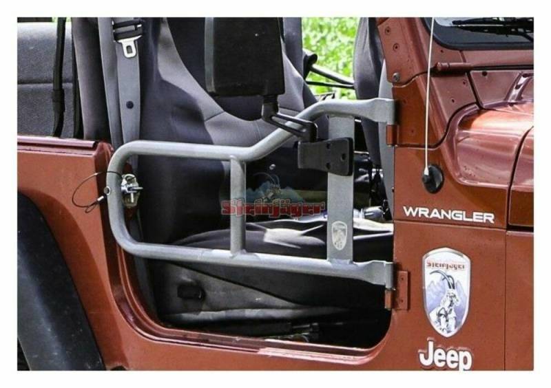 The Steinjager Tubular Trail Door's main construction is 1.25" and custom machined door hinges allow for easy switching from your stock door to the tube door. The quick release detent pin is held to the door with a weather resistant cable to ensure you don't lose your door latch pin. Please note, because of tolerances between Jeeps, you may have to slightly adjust or shim the factory striker for the latch to function smoothly. These doors accept our bolt on mirror kit but do not come with them. Includes one pair of front tube doors.