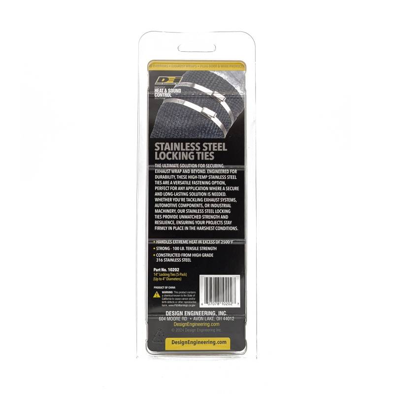 SS Locking Ties 14in 5pk Stainless-Steel Locking Ties secure exhaust wrap and solves the problem of needing a locking tie in high heat areas. Stainless-Steel Locking Ties are perfect for securing wrap to pipes with its self-locking design. Locking Ties offer many other uses including bundling wires, hoses, and other forms of insulation products. Just slide end into locking mechanism and pull tight. Constructed from high grade 316 stainless steel Capable of wit'standing in excess of 2500F 100lbs tensile strength Fits up to 4 in. O.D. Constructed Of High Grade 304 Stainless Steel Capable Of Wit'standing Heat In Excess Of 2500 Degrees F Strong 100 lb. Tensile Strength