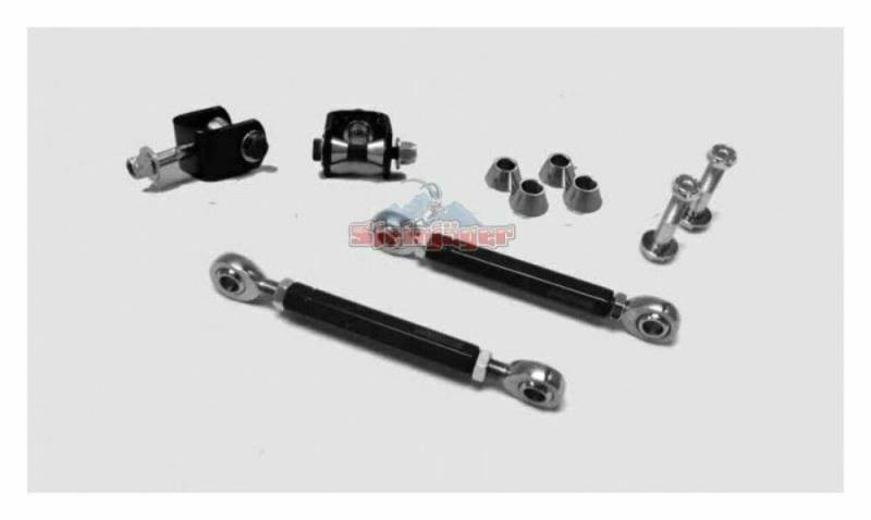 Kit includes one pair of front adjustable sway bar end links. The hex adjustors and clevises are black powder coated. The spherical rod ends are made of chrome moly steel and are bright polished chrome plated.