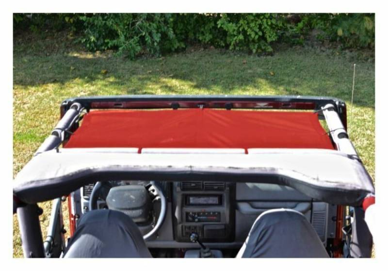 The Steinjager Teddy Top Solar Screen Cover easily installs in minutes with the use of the supplied bungee balls. There are cut-outs in the top to allow you to leave this cover on even when you have your factory top installed. Covers the front seats only.