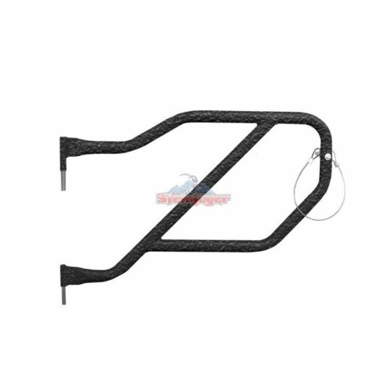 The Steinjager Tubular Trail Door's main construction is 1.25" and custom machined door hinges allow for easy switching from your stock door to the tube door. The quick release detent pin is held to the door with a weather resistant cable to ensure you don't lose your door latch pin. Please note, because of tolerances between Jeeps, you may have to slightly adjust or shim the factory striker for the latch to function smoothly. These doors accept our bolt on mirror kit but do not come with them. Includes one pair of rear tube doors.