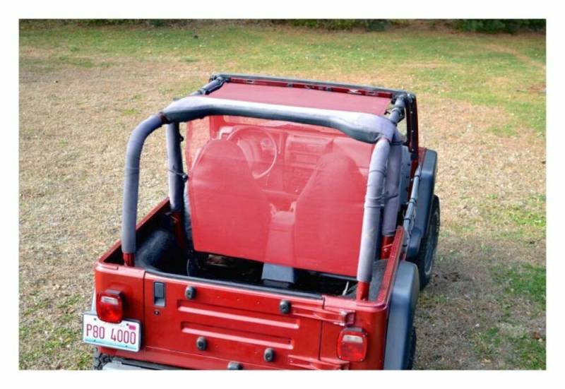 The Steinjager Teddy Top Truckster slides between the sound bar and the roll bar. It is easily installed with the use of bungee balls to hold it in place. The Truckster Top provides limited protection for the driver and passenger by blocking access to the cab from the top and back. The solar screen mesh also provides partial shade while still allowing visibility.