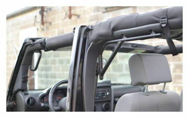 With an easy 10 minute install, you have sturdy, rigid grab handles to assist you getting in and out of your Jeep or a place to hold on to when you are on the toughest of trails. The solid bar design guarantees you years of use without any headaches. They are completely manufactured in the USA. Steinjager Grab Handles are designed to not interfere with the visors. Fornt and Rear bar set.