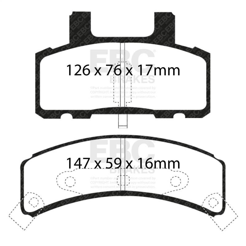 Yellowstuff Street And Track Brake Pads EBC Yellowstuff is an aramid fibre based brake compound with high brake effect form cold and is possibly one of the first ever compounds that can be used for STREET AND TRACK DRIVING. These pads do not require warm up but do get even stronger under the heat of hard driving. These are not a low dust pad and if your desire is for a low dust premium street use pad, you should consider EBC Redstuff.When considering full race use, Yellowstuff has been a strong favourite, having been used for two years in the Swedish Camaro Cup and at numerous other race events where a stock caliper system is fitted.It is also the choice of 90-percent of the Mazda MX5 Miata competitors in the UK race series and has an unblemished record as rotor friendly track pad for vehicles up to 2000 lbs weight or 200 BHP.In the USA the SCCA and NASA drivershave been testing Yellowstuff with feedback and good reports POURING in from a 543 test driver major market proving event with these groups. Read that figure again 543 test drivers.There is no guesswork here. High Friction Pad Better High Speed Stopping Zero Fade Race Developed Compound Brakes Effective Right From Cold Can Be Used On Street/Race Track