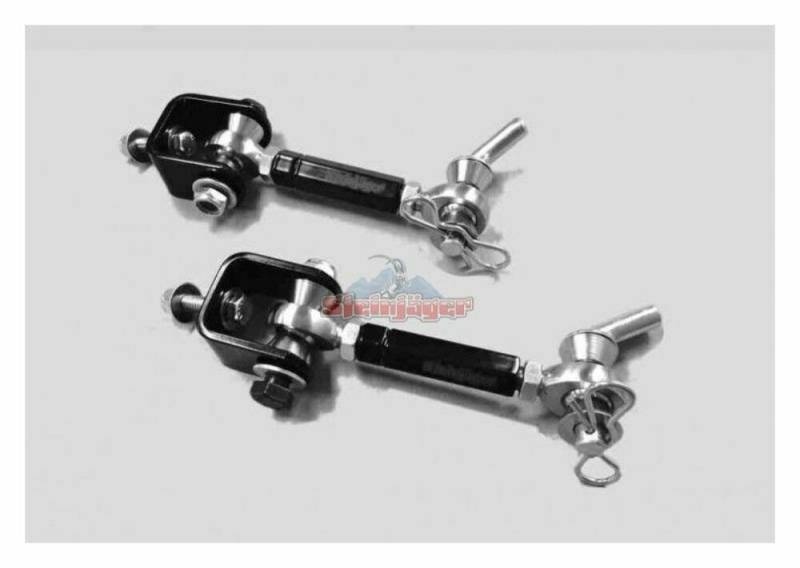 Kit includes one pair of front adjustable sway bar end links with quick disconnect pins. The hex adjustors and clevises are black powder coated. The spherical rod ends are made of chrome moly steel and are bright polished chrome plated.
