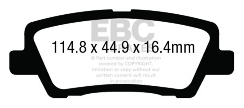Yellowstuff Street And Track Brake Pads EBC Yellowstuff is an aramid fibre based brake compound with high brake effect form cold and is possibly one of the first ever compounds that can be used for STREET AND TRACK DRIVING. These pads do not require warm up but do get even stronger under the heat of hard driving. These are not a low dust pad and if your desire is for a low dust premium street use pad, you should consider EBC Redstuff.When considering full race use, Yellowstuff has been a strong favourite, having been used for two years in the Swedish Camaro Cup and at numerous other race events where a stock caliper system is fitted.It is also the choice of 90-percent of the Mazda MX5 Miata competitors in the UK race series and has an unblemished record as rotor friendly track pad for vehicles up to 2000 lbs weight or 200 BHP.In the USA the SCCA and NASA drivershave been testing Yellowstuff with feedback and good reports POURING in from a 543 test driver major market proving event with these groups. Read that figure again 543 test drivers.There is no guesswork here. High Friction Pad Better High Speed Stopping Zero Fade Race Developed Compound Brakes Effective Right From Cold Can Be Used On Street/Race Track
