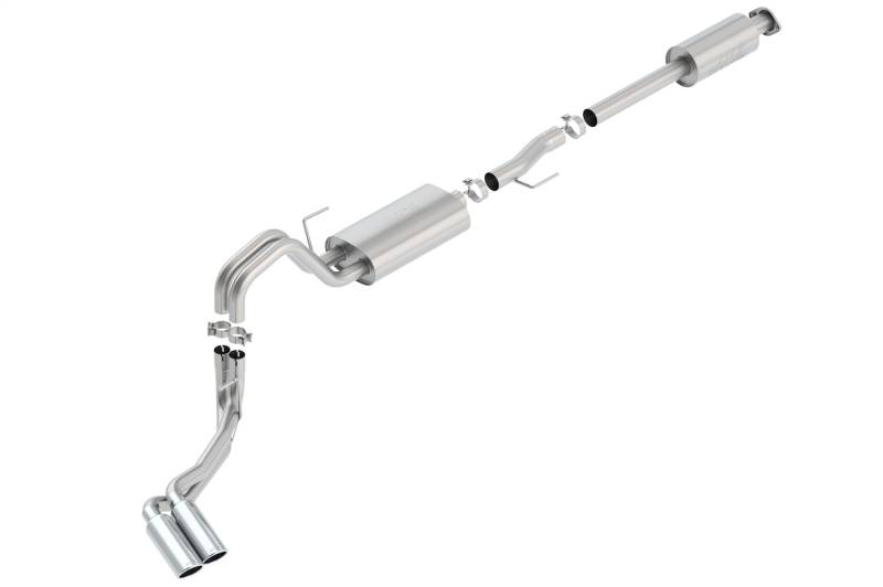 Cat-Back Exhaust System - S-Type EXCEPT Raptor. Add Adapter 60556 for Crew Cab with Standard Bed (6' 7") 156.8" wheelbase, or Adapter 60564 for Ext. Cab with Long Bed (8' 2") 163.7" wheelbase. This 3" into dual 2.25" system features the classic S-Type sound with no drone inside the vehicle and exits through 4" bright chrome on T-304 stainless steel tips. A system with black chrome on T-304 stainless steel tips is also available. Borla(r) Cat-Back(tm) & Axle-Back exhaust systems feature patented straight-through and multi-core technology designed to unleash hidden horsepower. Increased exhaust velocity adds power, driving excitement, fuel economy, and the distinctive Borla(r) Sound of Power respected by motoring enthusiasts everywhere. Each system is built from premium T-304 stainless steel, superior to T-400 series knockoffs (such as 409), to give you the absolute best in performance and durability. Ultra-smooth mandrel bends ensure maximum flow & power, and precision computer numerical control (CNC) manufacturing ensures an accurate fit. Best of all, Borla(r) stands behind every system with a Million-Mile Warranty. Just what you'd expect from the worlds most experienced (and most winning) exhaust brand. Add Adapter 60556 for Crew Cab Standard Bed (156.8") wheelbase vehicles Add Adapter 60564 for Extended Cab Long Bed (163.7") wheelbase vehicles EXCEPT Raptor models