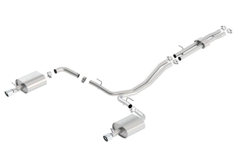 Cat-Back Exhaust System - S-Type System features polished T-304 stainless steel tips. Borla(r) Cat-Back(tm) & Axle-Back exhaust systems feature patented straight-through and multi-core technology designed to unleash hidden horsepower. Increased exhaust velocity adds power, driving excitement, fuel economy, and the distinctive Borla(r) Sound of Power respected by motoring enthusiasts everywhere. Each system is built from premium T-304 stainless steel, superior to T-400 series knockoffs (such as 409), to give you the absolute best in performance and durability. Ultra-smooth mandrel bends ensure maximum flow & power, and precision computer-controlled CNC manufacturing ensures an accurate fit. Best of all, Borla(r) stands behind every system with a Million-Mile Warranty. Just what you'd expect from the world's most experienced (and most winning) exhaust brand.