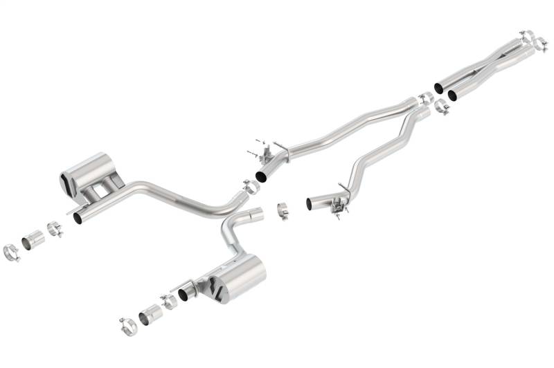 Cat-Back Exhaust System - ATAK® This 2.75" diameter Cat-Back(tm) system features a Merge X-Pipe for increased performance and improved sound. This system is equipped with MDS (multi-displacement system) valve simulators which ELIMINATE the MDS valves. This avoids any warning lights on the dash while providing maximum flow at all times. The system delivers the aggressive ATAK(r) sound with no drone inside the vehicle. Tips NOT included. Use factory valance / tips. BORLA(r) Cat-Back(tm) & Axle-Back exhaust systems feature patented straight-through and multi-core technology to unleash hidden horsepower. Increased exhaust velocity adds power, driving excitement, fuel economy, and the distinctive BORLA(r) Sound of Power respected by motoring enthusiasts everywhere. Each system is built from premium T-304 austenitic stainless steel, superior to T-400 series knockoffs (such as 409), to give you the absolute best in performance and durability. Ultra-smooth mandrel bends ensure maximum flow & power, and precision computer numerical control (CNC) manufacturing ensures an accurate fit. Best of all, BORLA(r) stands behind every system with a Million-Mile Warranty. Just what you’d expect from the world’s most experienced (and most winning) exhaust brand. This system INCLUDES Active Valve SIMULATORS System contains a Merge X-Pipe System does NOT include tips. Use factory Bezel/ Valance