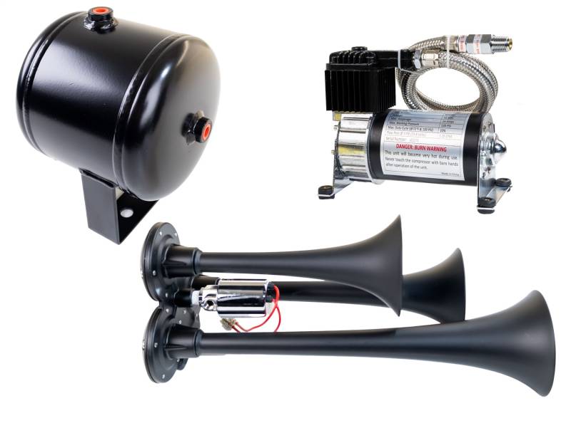 Compact triple train horn with all-metal trumpets 14.25 inches, 11.5 inches, and 9.25 inches in length. Produces a startling blended three-tone blast - guaranteed to get attention. Includes an easy-to- fit, 130 PSI air compressor and one gallon tank for more blast time. Available in chrome or XCR2.0 black finish P/N HK3-1.