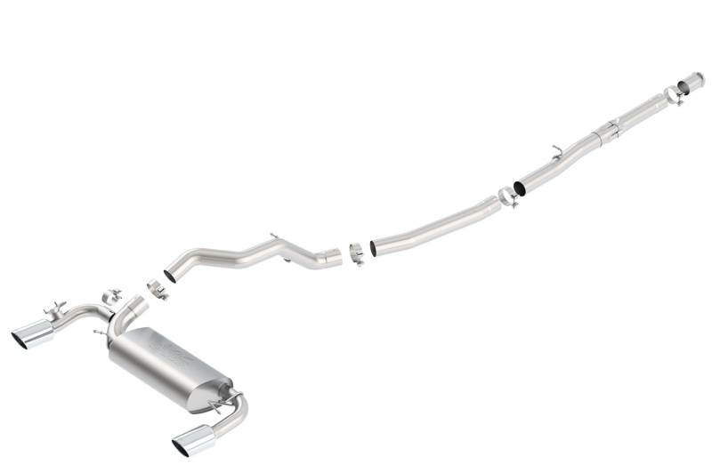 Cat-Back Exhaust System - ATAK® This system is equipped with a "Sound Suppressing Valve" simulator which ELIMINATES the valve. This avoids any warning lights on the dash while providing maximum flow at all times. System also features Boryla's Polyphonic Harmonizer Technology which utilizes patented units that contain pipes of different diameters and lengths to create multiple exhaust notes that harmonize to deliver a clean, rich, full-bodied sound to the Borla mufflers. The mufflers then enhance this sound to the character and volume appropriate for our Touring, S-Type and ATAK systems. This system features bright chrome on T-304 stainless steel tips. Borla Cat-Back & Axle-Back exhaust systems feature patented straight-through and multi-core technology to unleash hidden horsepower. Increased exhaust velocity adds power, driving excitement, fuel economy, and the distinctive Borla Sound of Power respected by motoring enthusiasts everywhere. Each system is built from premium T-304 austenitic stainless steel, superior to T-400 series knockoffs (such as 409), to give you the absolute best in performance and durability. Ultra-smooth mandrel bends ensure maximum flow & power, and precision computer-controlled CNC manufacturing ensures an accurate fit. Best of all, Borla stands behind every system with a Million-Mile Warranty. Just what you'd expect from the world's most experienced (and most winning) exhaust brand.