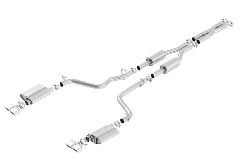 Cat-Back Exhaust System - S-Type This 2.5" diameter Cat-Back system features our latest engineering techniques to give you our classic S-Type sound without any "drone". The system features a Merge X-Pipe for increased performance and improved sound. The exhaust exits thru dual 4" x 2.5" rectangle polished T-304 stainless steel tips on each side for sharp appearance. BORLA Cat-Back & Axle-Back exhaust systems feature patented straight-through and multi-core technology designed to unleash hidden horsepower. Increased exhaust velocity adds power, driving excitement, fuel economy, and the distinctive BORLA Sound of Power respected by motoring enthusiasts everywhere. Each system is built from premium 300-series T-304 stainless steel, superior to T-400 series knockoffs (such as 409), to give you the absolute best in performance and durability. Ultra-smooth mandrel bends ensure maximum flow & power, and precision computer numerical control (CNC) manufacturing ensures an accurate fit. Best of all, BORLA stands behind every system with a Million-Mile Warranty. Just what you’d expect from the world's most experienced (and most winning) exhaust brand.