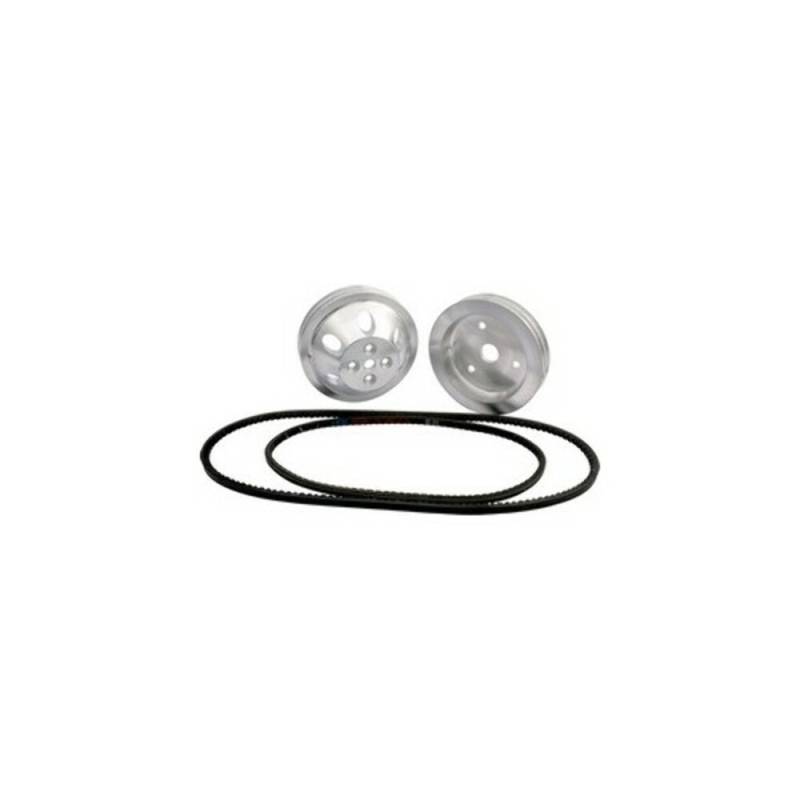 Double groove aluminum pulley kits include belts, crank pulley and water pump pulley with a 5/8" diameter hole. Components also sold separately.