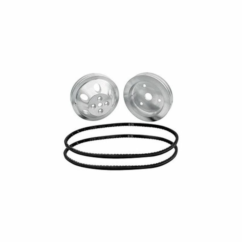 Double groove aluminum pulley kits include belts, crank pulley and water pump pulley with a 5/8" diameter hole. Components also sold separately.