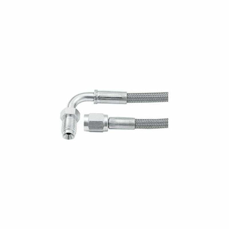 A wide selection of braided steel lines in various lengths. All lines come with one straight end and your choice of straight, 45 deg. or 90 deg. on the other end. The inner PTFE hose is compatible with all brake fluids. The braided stainless steel outer covering resists abrasion and corrosion. Ideal for use where bending and flexing occur. More durable than rubber hose. Lengths stated are overall end to end including fittings.