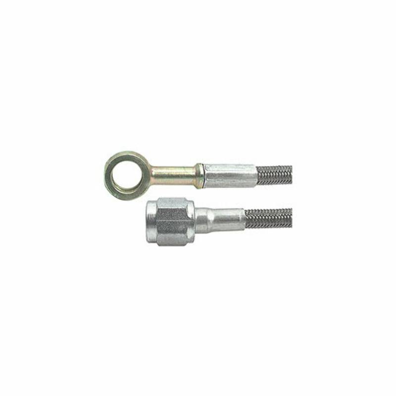 A wide selection of braided steel lines in various lengths. All lines come with one straight end and your choice of straight, 45 deg. or 90 deg. on the other end. The inner PTFE hose is compatible with all brake fluids. The braided stainless steel outer covering resists abrasion and corrosion. Ideal for use where bending and flexing occur. More durable than rubber hose. Lengths stated are overall end to end including fittings.
