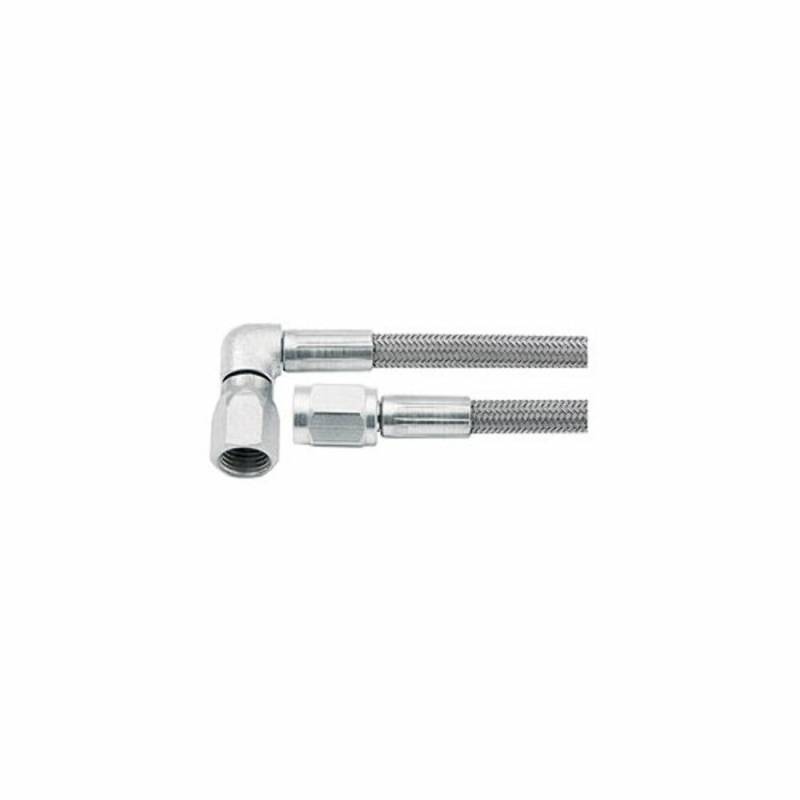 A wide selection of braided steel lines in various lengths. All lines come with one straight end and your choice of straight, 45 deg. or 90 deg. on the other end. The inner PTFE hose is compatible with all brake fluids. The braided stainless steel outer covering resists abrasion and corrosion. Ideal for use where bending and flexing occur. More durable than rubber hose. Lengths stated are overall end to end including fittings.