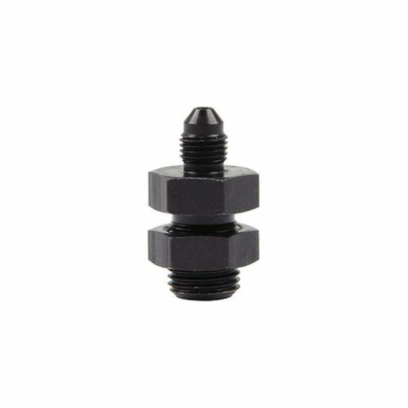 Bulkhead style aluminum fittings adapt 3/16" inverted flare line to an AN type fitting. The 9/16" threaded body with attaching nut can be mounted through a C-channel style frame or a chassis tab.