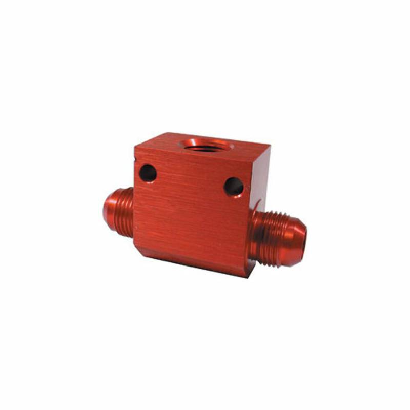 Install in the oil return line (pump-to-tank) to adapt a probe for an oil temperature gauge. All inline tees have 1/2"NPT threads for probe fittings and 1/4" holes for mounting.