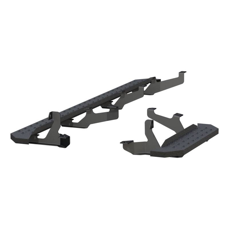 RidgeStep 6-1/2" x 96", 36" Black Steel Running Boards, Select Ram ProMaster Powerful, definitive and uncompromising as a mountain ridge, ARIES RidgeStep running boards are made for those who gets it done, day after day. With their solid, all-steel construction, non-skid treads and tough powder coat finish, RidgeStep running boards are made to finish the job. Installation of these running boards is easy and secure because they use the ARIES VersaTrac mounting system. The underside of each board is equipped with a channel that accepts a set of heavy-duty bracket inserts. The inserts move along the channel to fit your cargo van, and the mounting hardware provides a secure attachment. These running boards are designed to fit specific years of the Ram ProMaster 2500 and 3500 (NOTE: This set of running boards includes vehicle-specific VersaTrac mounting brackets. See the application information to verify compatibility with your vehicle). ARIES RidgeStep running boards are not only made for easier installation, but they are also built to face the harsh elements of the commercial job. They feature high-strength, solid steel construction for a step that can keep up with those steel-toe boots, and they are completely without plastic parts, meaning they will not crack or fade over time. Their stamped, all-steel tread offers a 6-1/2" wide, non-skid surface that will never wear down no matter how many times you climb in and out of your work van. The end caps are also made from steel and are welded to contour to the body of your van for a professional finish. RidgeStep running boards come with a unique E-coat and textured black powder coat finish to not only withstand rust but also to hide minor scratches and grime. High-strength, all-steel construction with no plastic parts Angular design for a tough, no-nonsense look on hardworking vehicles Stamped steel treads for a non-skid step that will never wear or crack Flat profile and 6-1/2" width provide a comfortable step Textured black powder coat easily hides minor scratches and grime