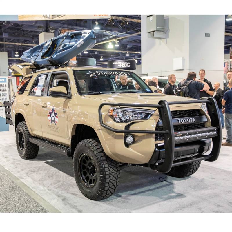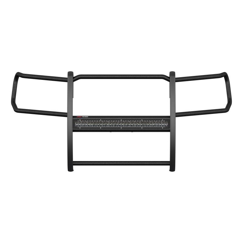 Pro Series Black Steel Grille Guard with Light Bar, Select Toyota 4Runner The ARIES Pro Series grille guard is unlike any other grille guard or brush guard on the road today because of its patented center crossbar. The ARIES Pro Series grille guard has a unique center crossbar that houses an LED light bar, allowing you to truly set your truck apart from all others. Rather than using a set of light clips or forcing you to drill holes into the frame, the aerodynamic crossbar of the Pro Series grille guard is the light bar housing itself. It uses a 30" slotted channel bracket to mount the included 30" LED light bar #1501264. The bracket can also accept other single-row light bars (some 30" light bars may not fit). The crossbar mount can also articulate, allowing you to position the light beam at any angle you prefer. Integrating the channel mount into the crossbar housing also keeps the light bar protected from the elements. To further stylize your truck, the Pro Series grille guard also comes with an interchangeable grille guard cover plate. Included with each grille guard is a black mesh cover plate that easily bolts on and provides added security for your aftermarket lights. The mesh cover plate can be swapped out with ot her cover plate options, including five different styles and two finishes. Solid construction should be an essential feature of any grille guard, and the Pro Series grille guard is more than qualified. It has a one-piece design of 1/4" thick welded plates and 1-1/2" mandrel-bent carbon steel tubing. We also finish each Pro Series grille guard in a highly durable, dual-layer E-coat and textured black powder coat, giving it resilience to rust and scratches. This unique finish also helps hide minor scratches and grime to maintain a clean look. ARIES Pro Series grille guards are made vehicle-specific for seamless integration with the factory bumper and an easy, no-drill installation. This grille guard fits select model years of the Toyota 4Runner (see application info to verify fitment). Patented crossbar houses a single-row LED light bar Interchangeable cover plate protects light bar and offers easy customization Grade-A LED chips offer 14,800-lumen, combo beam pattern Light bar features waterproof aluminum housing and IP68-standard breather Fitted with a strong, waterproof wiring harness for a reliable connection