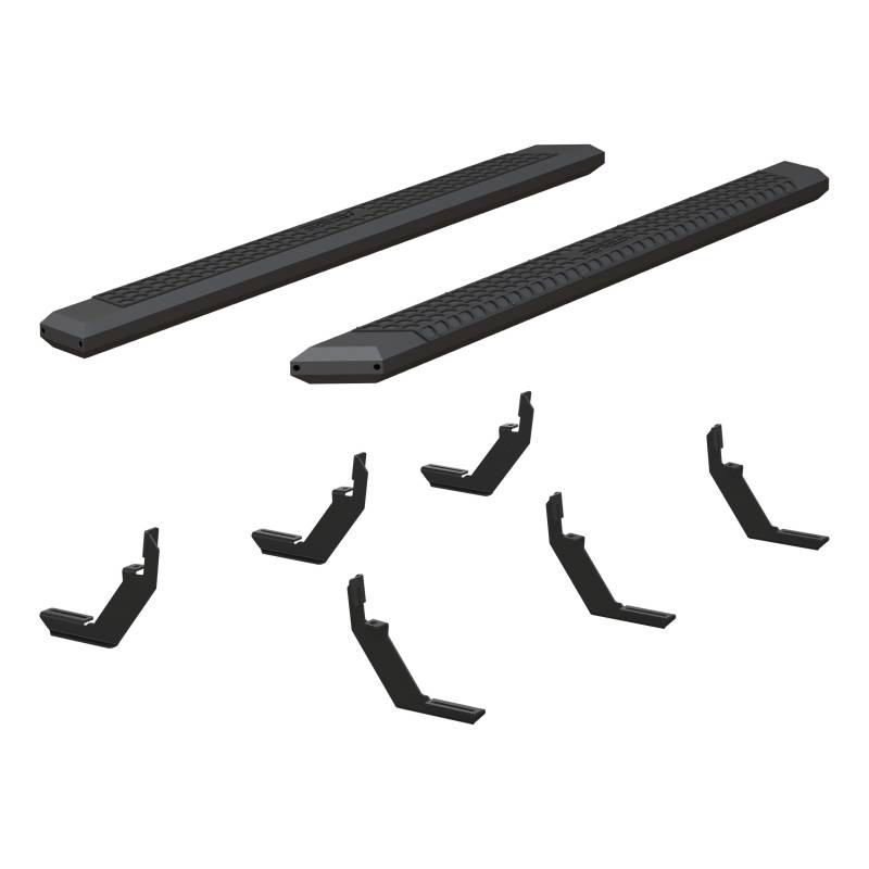 AdvantEDGE 5-1/2" x 85" Black Aluminum Side Bars, Select Colorado, Canyon ARIES AdvantEDGE side bars do away with the common, rounded look of other side bars, nerf bars and running boards, featuring an angular, eight-sided tube profile and powder-coated all-aluminum construction. The angular edges provide a clear-cut, uncompromising accent for the look of today's trucks. Made from 5-1/2" wide, eight-sided, extruded aluminum tubing, AdvantEDGE running boards are strong, lightweight and impervious to rust, offering a solid step that is built to face the elements and outlast them. They also come with die-cast aluminum end caps and a stamped aluminum tread. The aluminum treads provide a long-lasting, non-skid stepping surface that will not crack or fade in the sun. ARIES AdvantEDGE side bars are also marked for their easy, custom-fit installation. They feature the ARIES VersaTrac mounting system with brackets that are made from powder-coated steel and built for specific vehicles. This particular set of custom running boards fits specific years of the Chevy Colorado and GMC Canyon (see application info to verify compatibility). The high-strength steel brackets mount using pre-existing holes, and the aluminum running boards attach to the brackets with heavy-duty hardware. The VersaTrac mounting system makes installation simple and customizable, allowing the side bars to be swapped out at any time with other side steps or running boards that use th e VersaTrac system. Setting yourself apart is simple with the ARIES AdvantEDGE series. In addition to these truck side steps, we also offer the AdvantEDGE bull bar and AdvantEDGE headache rack, featuring the same all-aluminum construction and eight-sided tube profile. For a fully customized look to match your pickup, AdvantEDGE side bars are available in two finish options, including carbide black powder coat and chrome powder coat. Unique, eight-sided tube profile to complement the style of modern trucks Extruded, all-aluminum construction to be strong, lightweight and rust-free Stamped aluminum treads for a non-skid step that will never crack or fade Die-cast aluminum end caps for a durable accent Tough carbide black powder coat finish with textured black powder-coat step pads