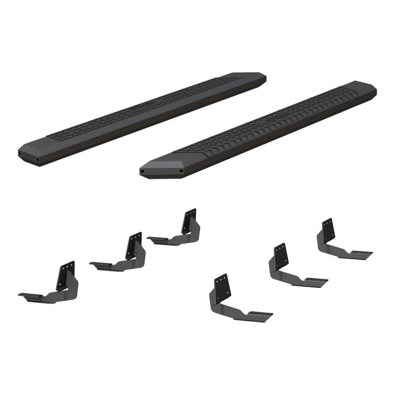 AdvantEDGE 5-1/2" x 75" Black Aluminum Side Bars, Select Ram 1500 ARIES AdvantEDGE side bars do away with the common, rounded look of other side bars, nerf bars and running boards, featuring an angular, eight-sided tube profile and powder-coated all-aluminum construction. The angular edges provide a clear-cut, uncompromising accent for the look of today's trucks. Made from 5-1/2" wide, eight-sided, extruded aluminum tubing, AdvantEDGE running boards are strong, lightweight and impervious to rust, offering a solid step that is built to face the elements and outlast them. They also come with die-cast aluminum end caps and a stamped aluminum tread. The aluminum treads provide a long-lasting, non-skid stepping surface that will not crack or fade in the sun. ARIES AdvantEDGE side bars are also marked for their easy, custom-fit installation. They feature the ARIES VersaTrac mounting system with brackets that are made from powder-coated steel and built for specific vehicles. This particular set of custom running boards fits specific years of the Ram 1500 (see application info to verify compatibility). The high-strength steel brackets mount using pre-existing holes, and the aluminum running boards attach to the brackets with heavy-duty hardware. The VersaTrac mounting system makes installation simple and customizable, allowing the side bars to be swapped out at any time with other side steps or running boards that use the VersaTrac system. Setting yourself apart is simple with the ARIES AdvantEDGE series. In addition to these truck side steps, we also offer the AdvantEDGE bull bar and AdvantEDGE headache rack, featuring the same all-aluminum construction and ei ght-sided tube profile. For a fully customized look to match your pickup, AdvantEDGE side bars are available in two finish options, including carbide black powder coat and chrome powder coat. Unique, eight-sided tube profile to complement the style of modern trucks Extruded, all-aluminum construction to be strong, lightweight and rust-free Stamped aluminum treads for a non-skid step that will never crack or fade Die-cast aluminum end caps for a durable accent Tough carbide black powder coat finish with textured black powder-coat step pads