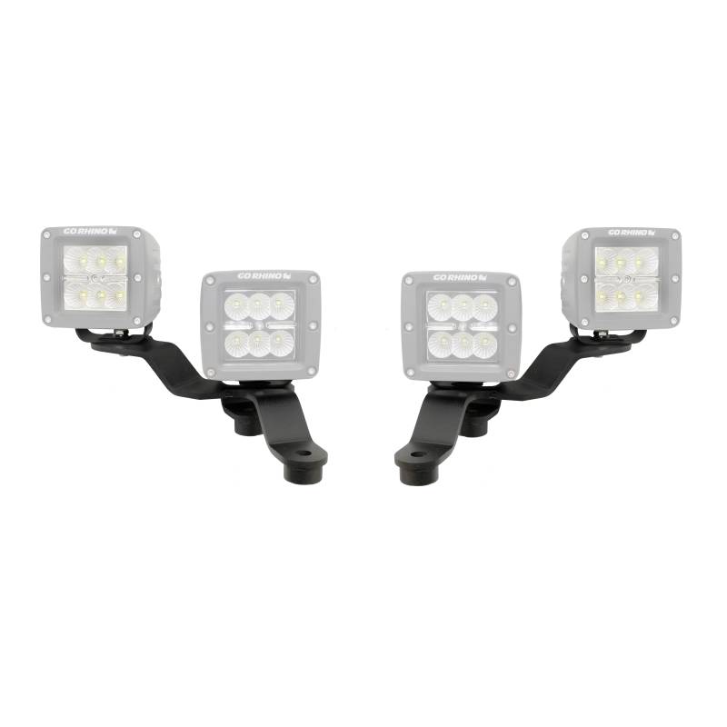 Jeep Wrangler JL, JLU and JT Windshield Cowl Light Mount for two 3 in. X 3 in. industry standard cube LED's, kit includes mounts for both driver and passenger windshield cowl. Mounts 2 cube lights at 2 different elevations creating a stacked effect. Light Mounts come with a Limited Lifetime warranty on materials and construction and a 5 year warranty on the Textured Black Finish.