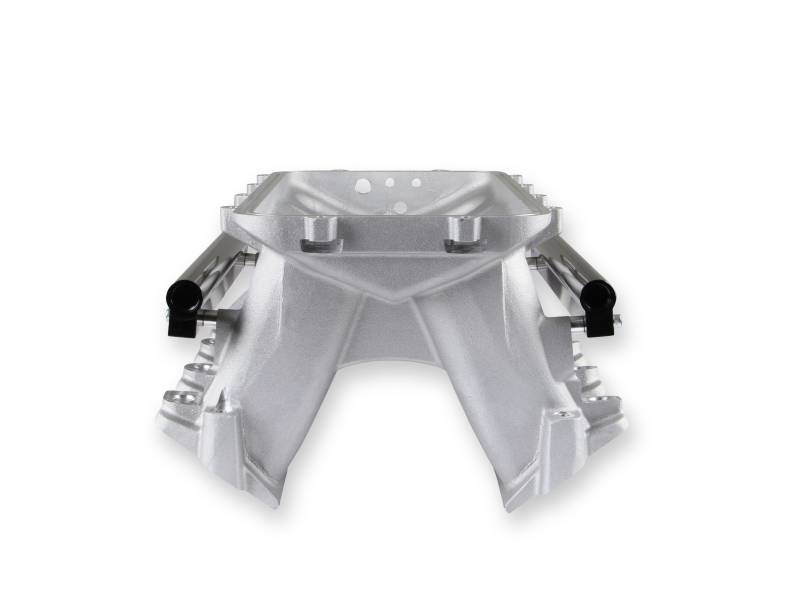 • Cast aluminum construction.\n• Runner length and the tapered cross-section designed to perform well for a wide range of engine configurations\nThe Holley GM LS3/L92 Modular Hi-Ram Intake Manifold is introduced as a cost effective alternative to fabricated sheet-metal for high-performance applications where induction system height is not limited. Coupling this Hi-Ram intake with the high flowing LS3/L92 style cylinder heads has outstanding potential for N/A and forced induction applications at a budget-minded cost. Aggressive, bold, race-bred styling will make bad intentions clear for drag race, muscle car, marine, off-road, sandrails, pulling trucks, track, street-rod applications and more!\n• Intended for use on naturally aspirated or forced induction engines in the 6.0 to 7.0+ liter range, max power at 7000-8000+RPM.\n• The base is designed to be modular in configuration to accept a wide range of carbureted and EFI tops and to be attractive to builders and fabricators as the foundation for custom induction systems.\n• EFI fuel rails are machined for -8AN O-ring fittings with passages large enough to accommodate high fuel flows and dampen pressure pulsations in the fuel system and come standard with EFI Hi-Ram kits.