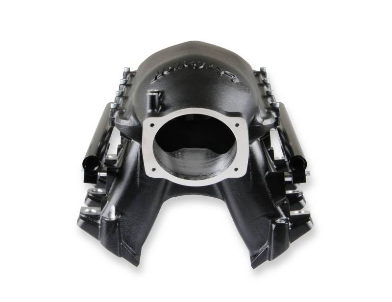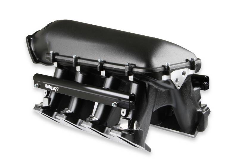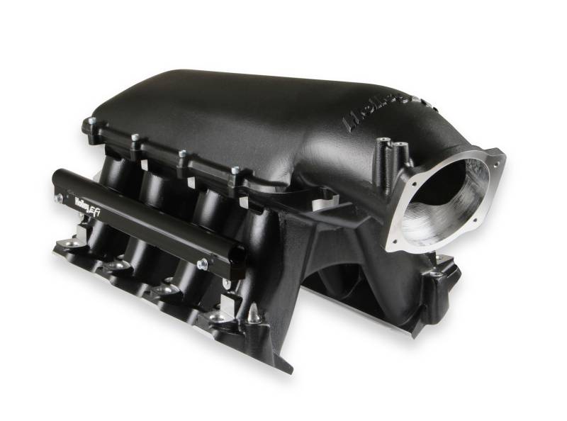 The Holley GM LS3/L92 Modular Hi-Ram Intake Manifold is introduced as a cost effective alternative to fabricated sheet-metal for high-performance applications where induction system height is not limited. Coupling this Hi-Ram intake with the high flowing LS3/L92 style cylinder heads has outstanding potential for N/A and forced induction applications at a budget-minded cost. Aggressive, bold, race-bred styling will make bad intentions clear for drag race, muscle car, marine, off-road, sandrails, pulling trucks, track, street-rod applications and more!\n• The base is designed to be modular in configuration to accept a wide range of carbureted and EFI tops and to be attractive to builders and fabricators as the foundation for custom induction systems.\n• EFI fuel rails are machined for -8AN O-ring fittings with passages large enough to accommodate high fuel flows and dampen pressure pulsations in the fuel system and come standard with EFI Hi-Ram kits.\n• Cast aluminum construction.\n• Intended for use on N/A or forced induction engines in the 6.0 to 7.0+ liter range, max power at 7000-8000+RPM.\n• Runner length and the tapered cross-section designed to perform well for a wide range of engine configurations