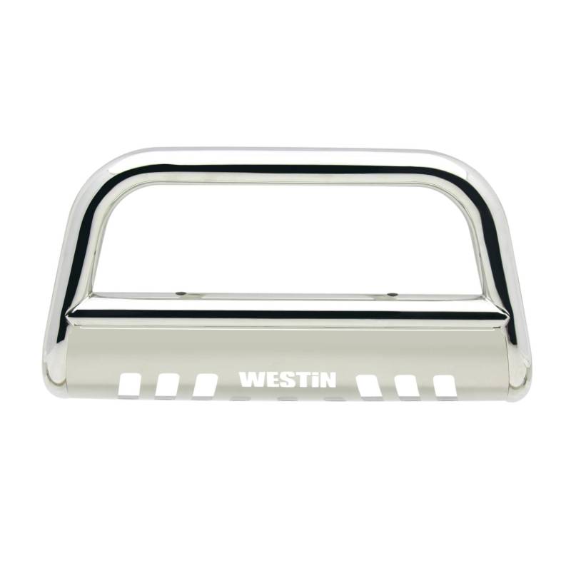 E-Series Bull Bar Westin E-Series Bull Bars are a front-end light bar designed for trucks and larger model SUVs. It is made of 3 diameter polished stainless steel tube. It mounts utilizing existing vehicle mounting points and installation does not require any drilling to the vehicle frame. Comes complete with mounting kit the Westin E-Series Bull Bar provides a mounting point for 2 auxiliary lights up to 6 in diameter. It features a die-cut Westin block logo design on the stainless steel skid plate unique to the Westin E-Series Bull Bar. Mount kit included Made of 3" diameter stainless steel tubing Stainless bull bar comes with brushed skid plate Black bull bar comes with textured black skid plate Fully welded cross tube