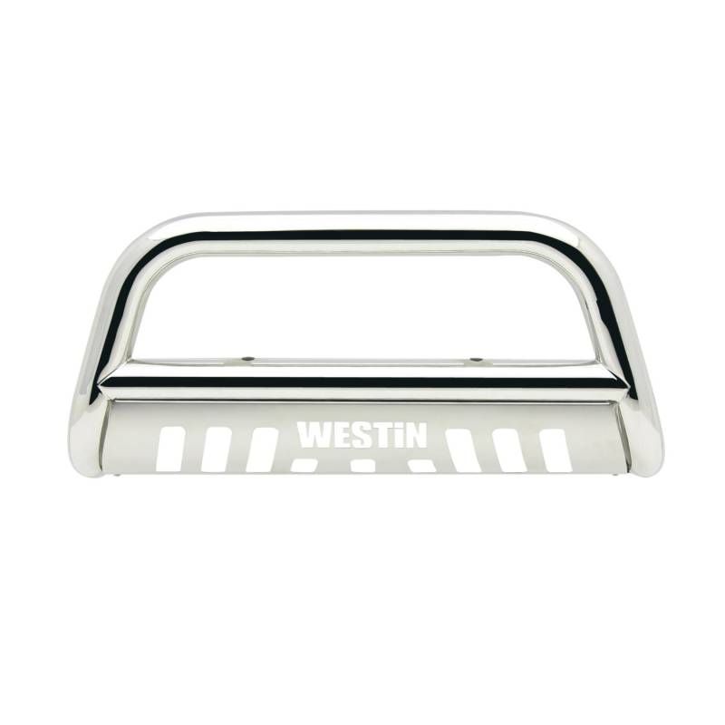 E-Series Bull Bar Westin E-Series Bull Bars are a front-end light bar designed for trucks and larger model SUVs. It is made of 3 diameter polished stainless steel tube. It mounts utilizing existing vehicle mounting points and installation does not require any drilling to the vehicle frame. Comes complete with mounting kit the Westin E-Series Bull Bar provides a mounting point for 2 auxiliary lights up to 6 in diameter. It features a die-cut Westin block logo design on the stainless steel skid plate unique to the Westin E-Series Bull Bar. Mount kit included Made of 3" diameter stainless steel tubing Stainless bull bar comes with brushed skid plate Black bull bar comes with textured black skid plate Fully welded cross tube