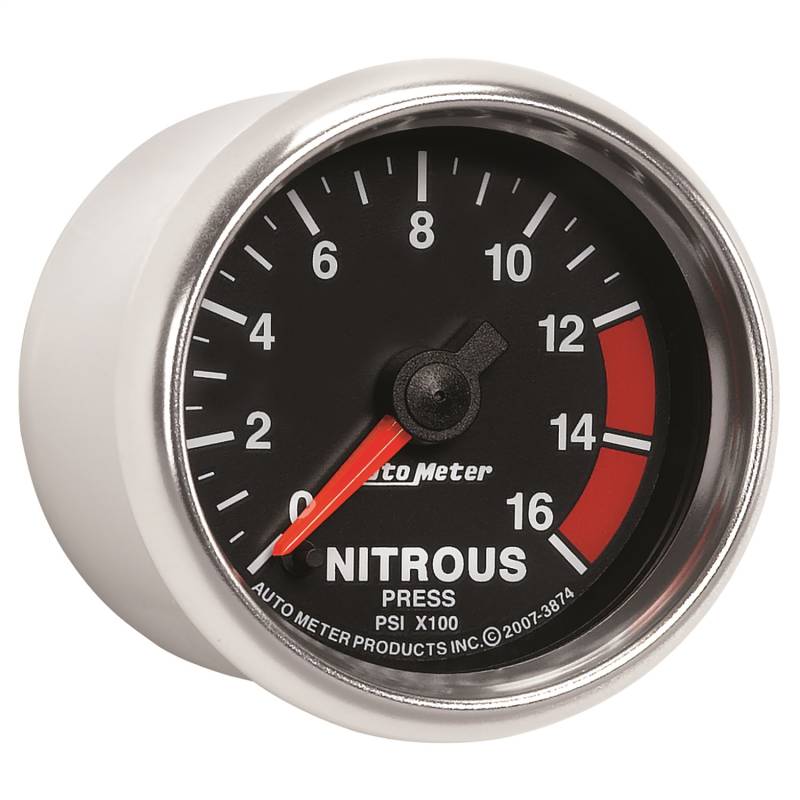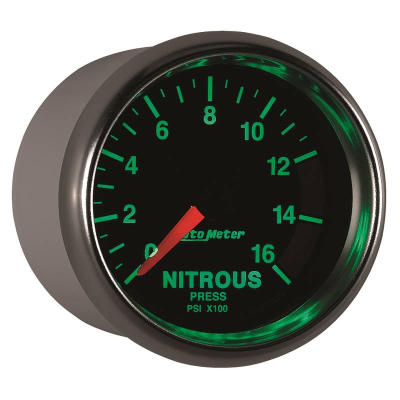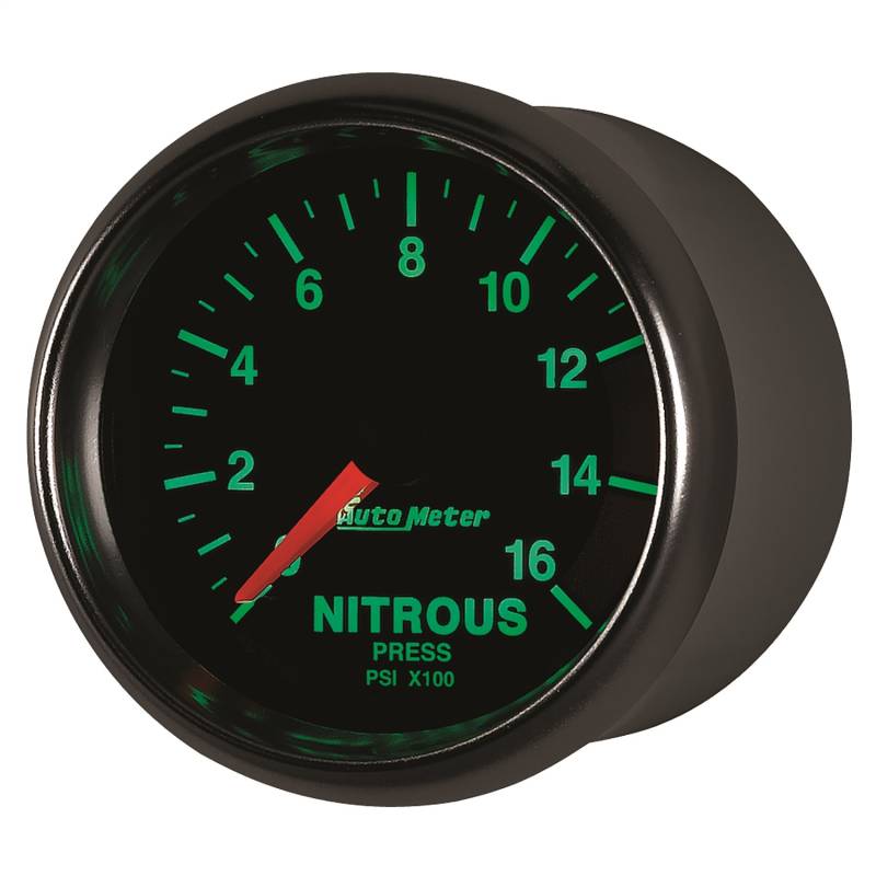 GAUGE, NITROUS PRESSURE, 2 1/16", 1600PSI, DIGITAL STEPPER MOTOR, GS Proper Nitrous Pressure Is The Difference Between Extracting Maximum Power From Your Engine And Finishing Second. Autometers Digital Stepper Motor Nitrous Pressure Gauge Uses Our Advanced 1/8" Npt Solid State Pressure Transducer To Give You The Most Precise Possible Reading Of Your System Pressure ,Up To 1600 Psi. Built With The Accuracy And Durability Required By The Professional Racer, There Simply Isnt A Better Possible Solution. A Direct Plug In Wiring Harness Is Included For Ease Of Installation And Data Logging Is Available Thanks To A .5 - 4.5V Analog Output. Modern green LED through-the-dial lighting provides clear visibility during nighttime use Includes data acquisition grade solid-state pressure transducer, providing unmatched accuracy and durability even in the harshest environments Autometers Race Proven Digital Stepper Motor Electric Instruments Provide Unmatched Accuracy While Keeping Hazardous Fluids Outside Of The Vehicle The accuracy of digital stepper motor gauges is further increased by utilizing a self calibration sequence during power up Gauge kit includes 1/8" NPT stainless steel pressure transducer, wiring harness, mounting hardware, and detailed instructions for installation