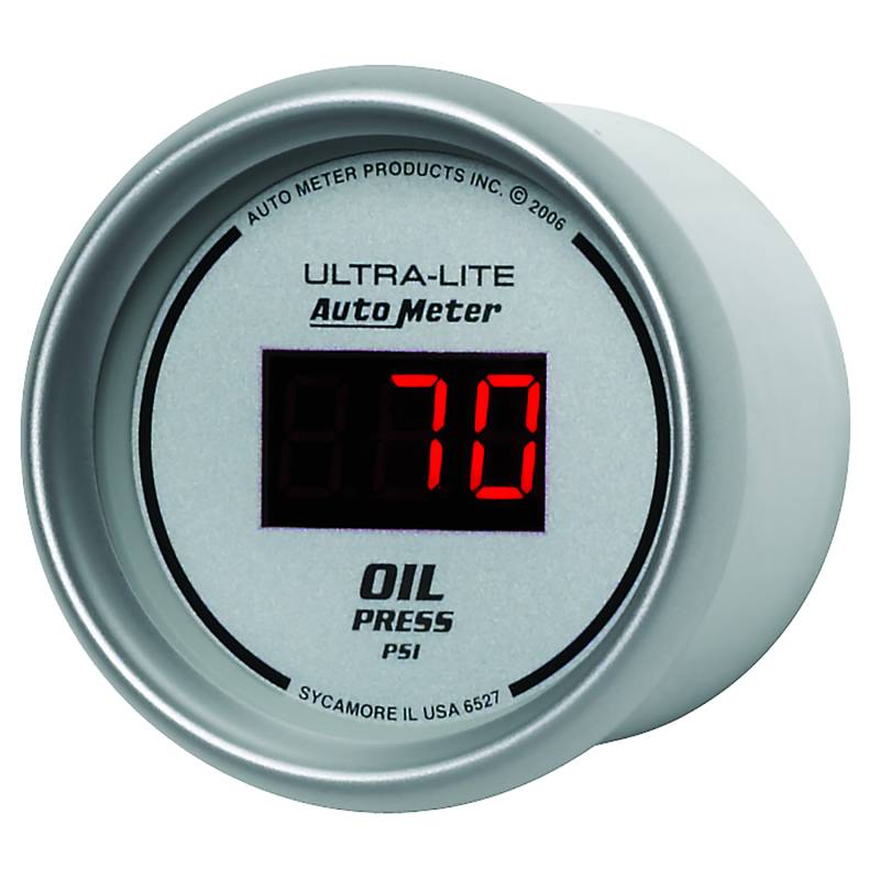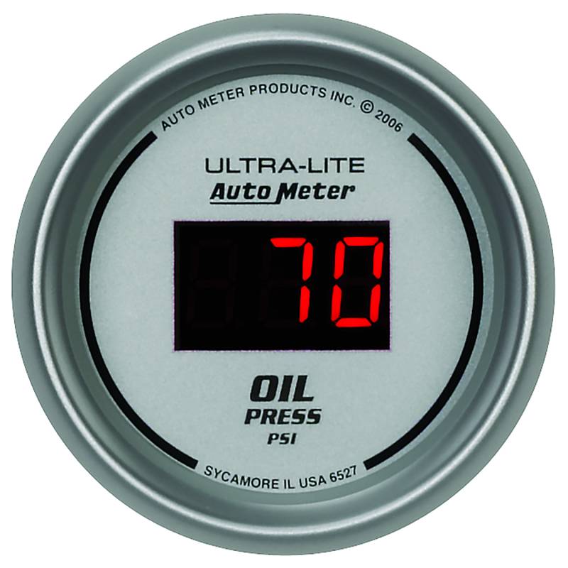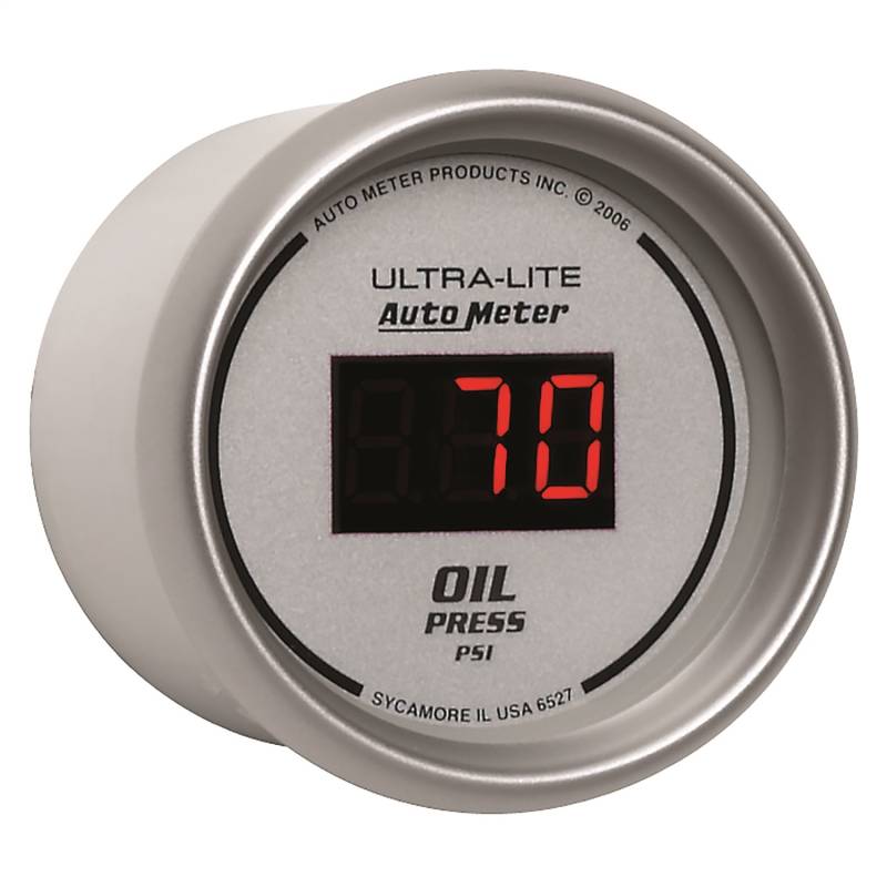 GAUGE, OIL PRESSURE, 2 1/16", 100PSI, DIGITAL, SILVER DIAL W/ RED LED Without Oil Pressure, Your Engine Is Not Likely To Run For Long. There Are Few Parameters That Are More Important To Have Precise Readings On In Your Vehicle. Autometers Digital Oil Pressure Gauges Uses An 1/8" Npt Pressure Transducer For Incredible Accuracy And Response Time. Features Autometers E-Z View Digital Led Display System Which Maximizes Readability And Minimizes Distracting High Speed Digit Changes Includes race-proven pressure transducer, providing unmatched accuracy and durability even in the harshest environments Autometers Race Proven Digital Stepper Motor Electric Instruments Provide Unmatched Accuracy While Keeping Hazardous Fluids Outside Of The Vehicle Gauge kit includes 1/8" NPT pressure transducer, 1/4" NPT adapter, wiring harness, mounting hardware, and detailed instructions for installation 12 and 16 volt compatible, compatible with nearly every street car or race car electrical system