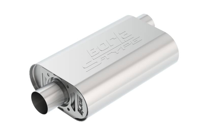 CrateMuffler - S-Type Borla 's CrateMuffler is the world's first muffler purpose-built to optimize the sound & power of crate and custom built motors. The mufflers are directional. The outlet can be identified by the mounting bracket welded to the endcap. The directional design provides custom sound, tuned for each engine family and will dramatically reduce, or eliminate drone on specified applications. Built from premium T-304 stainless steel, superior to T-400 series (such as 409), to give you the absolute best in performance and durability. Precision computer numerical control (CNC) manufacturing ensures an accurate fit and best of all, Borla stands behind every CrateMuffler with a Million-Mile Warranty. Just what you'd expect from the world's most experienced (and most winning) exhaust brand. CrateMufflers are tuned for specific engines When installed on cataloged applications, they will reduce, or eliminate drone Mufflers have directional flow. Outlet end has mounting bracket on it. Add resonator 400938 to attain the Touring sound level