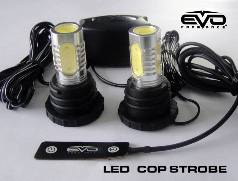 EVO Formance LED Cop Headlight Strobes - Blue. EVO's LED Cop Strobes are powerful, professional grade strobes. Each bulb emits more than 300lm of light. Each bulb projects light in all directions, and has a new base where the bulb is twisted into position. You can use the included switch to select between "steady on" and 5 different flashing sequences. The control box and strobe bulbs are waterproof. These bulbs are made with strong materials, making them water and impact resistant.